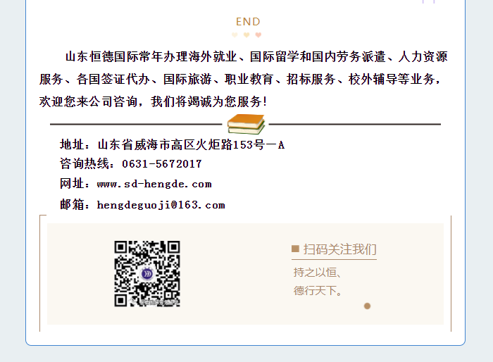 版權所有:山東恒德國際經濟技術合作有限公司 威海恒德職業培訓學校 地址:威海市高區火炬路153號-A  免費熱線:4006150009