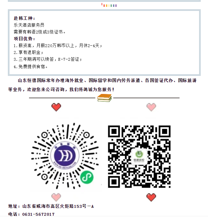 版權所有:山東恒德國際經濟技術合作有限公司 威海恒德職業培訓學校 地址:威海市高區火炬路153號-A  免費熱線:4006150009