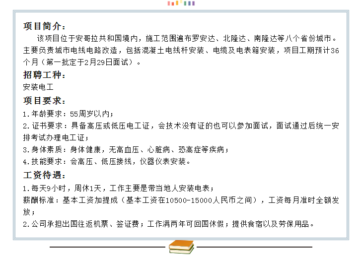 【恒德國際】安哥拉安裝電工項目定于2月29日面試
